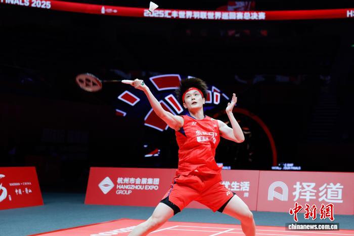 12月17日,2025年寰球羽联宇宙巡礼赛总绝赛正在浙江杭州举办。正在尾日停止的女单小组赛B组角逐中,中原选脚王祉怡2:0打败队友韩悦。图为华夏选脚韩悦正在角逐中交球。中新社记者 肖健 摄